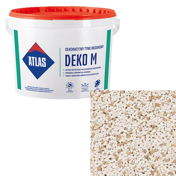 Deko M jest specjalnie przygotowaną linią tynków mozaikowych, opartych na nowoczesnej bazie składającej się z mieszanki wodnych dyspersji akrylowych, środków hydrofobizujących, dodatków modyfikujących oraz specjalnie wyselekcjonowanych kruszyw naturalnych i barwionych.