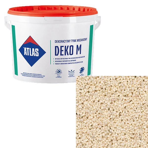 Deko M jest specjalnie przygotowaną linią tynków mozaikowych, opartych na nowoczesnej bazie składającej się z mieszanki wodnych dyspersji akrylowych, środków hydrofobizujących, dodatków modyfikujących oraz specjalnie wyselekcjonowanych kruszyw naturalnych i barwionych.