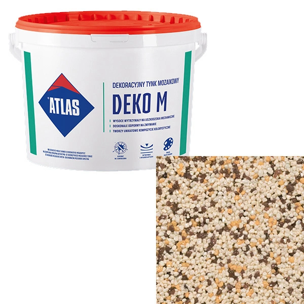 Deko M jest specjalnie przygotowaną linią tynków mozaikowych, opartych na nowoczesnej bazie składającej się z mieszanki wodnych dyspersji akrylowych, środków hydrofobizujących, dodatków modyfikujących oraz specjalnie wyselekcjonowanych kruszyw naturalnych i barwionych.