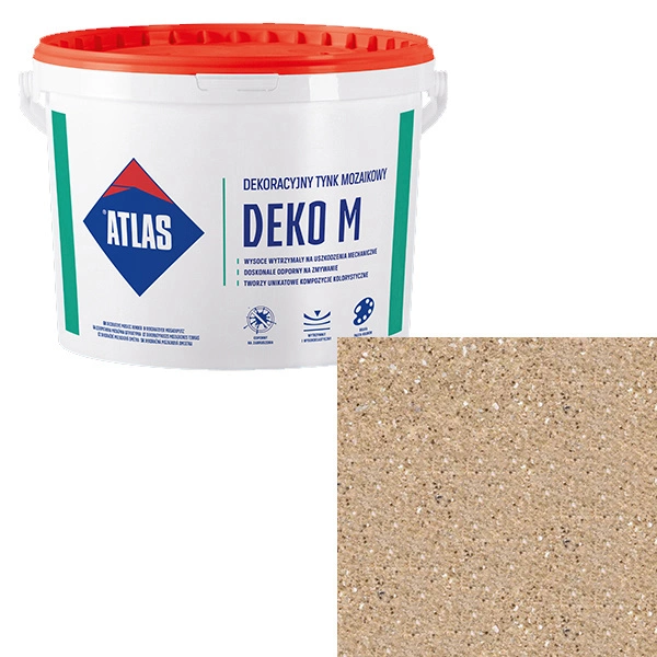 Deko M jest specjalnie przygotowaną linią tynków mozaikowych, opartych na nowoczesnej bazie składającej się z mieszanki wodnych dyspersji akrylowych, środków hydrofobizujących, dodatków modyfikujących oraz specjalnie wyselekcjonowanych kruszyw naturalnych i barwionych.
