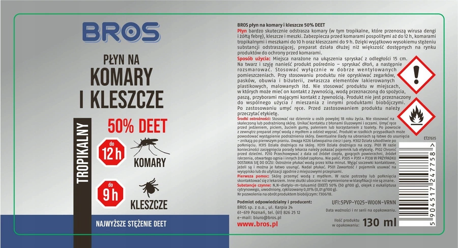 Płyn na komary/kleszcze DEET 50% 130ml BROS jest przeznaczony do ochrony przed ukąszeniami komarów, kleszczy, meszek i innych owadów. Doskonały podczas spacerów po lesie, wypraw na ryby, biwaków, prac w ogrodzie, wyjazdów na działkę oraz podróży do krajów o podwyższonym ryzyku występowania insektów.