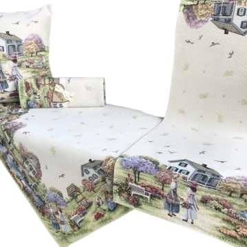 Bieżnik przygotowany z delikatnym wzorem domku i postaci nad jeziorem. Jest cudowną dekoracją stołu w jadalni, kuchni czy salonie. Tak dobrana kolorystyka doskonale wpisuje się w okres wiosny czy lata, stając się dodatkową dekoracją wnętrza.