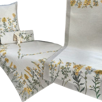 Obrus EDEN Żółte kwiaty wspaniale sprawdzi się w kuchni, jadalni lub salonie, wprowadzając przytulny, słoneczny klimat. To doskonały wybór na rodzinne śniadania, popołudniowe kawy czy świąteczne spotkania. Pięknie prezentuje się podczas wiosennych i letnich uroczystości, a także jako dekoracja stołu w ogrodzie lub na tarasie. Stwórz wyjątkowy nastrój podczas codziennych chwil i wyjątkowych okazji.