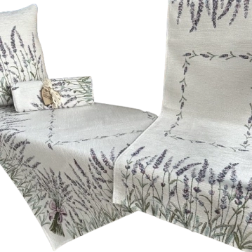 Bieżnik przygotowany z delikatnym wzorem- lawendy. Jest cudowną dekoracją stołu w jadalni, kuchni czy salonie. Tak dobrana kolorystyka doskonale wpisuje się w okres wiosny czy lata, stając się dodatkową dekoracją wnętrza.