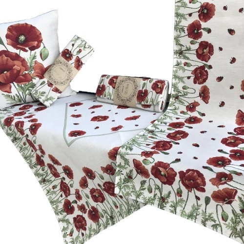 Bieżnik przygotowany z pięknym wzorem w maki. Jest cudowną dekoracją stołu w jadalni, kuchni czy salonie. Tak dobrana kolorystyka doskonale wpisuje się w okres wiosny czy lata, stając się dodatkową dekoracją wnętrza.