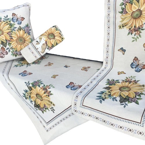 Bieżnik przygotowany z pięknym wzorem w słoneczniki i motyle. Jest cudowną dekoracją stołu w jadalni, kuchni czy salonie. Tak dobrana kolorystyka doskonale wpisuje się w okres wiosny czy lata, stając się dodatkową dekoracją wnętrza.