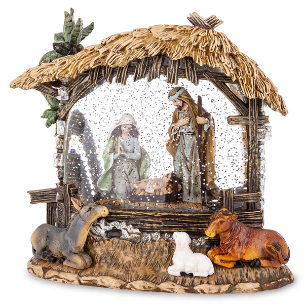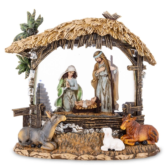 Klasyczna kula śnieżna z piękną figurką Świętej Rodziny wewnątrz, otoczona delikatnie wirującym śniegiem. Szklana kopuła osadzona na dekoracyjnej podstawie skrywa pozytywkę, która po nakręceniu odtwarza nastrojową melodię świąteczną. Idealna jako wyjątkowa dekoracja bożonarodzeniowa lub prezent z duchowym przesłaniem.
