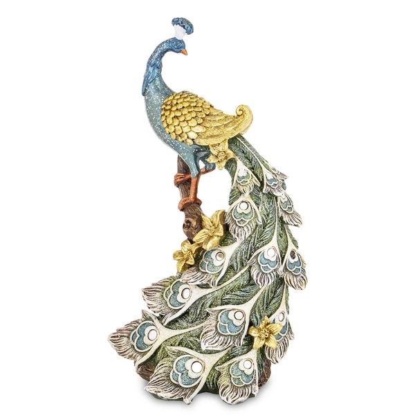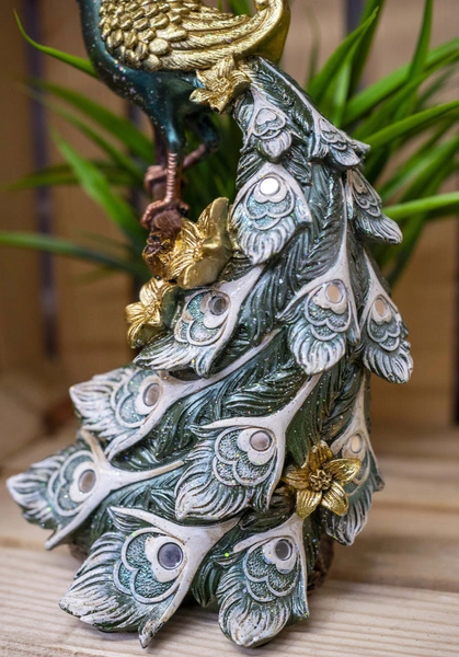 Możesz wykorzystać ją jako centralny element świątecznej lub zimowej aranżacji – w otoczeniu zielonych gałązek, lampek i błyszczących bombek podkreśli odświętny klimat. W sypialni stanie się stylową ozdobą toaletki lub półki nad łóżkiem, dodając wnętrzu nuty glamour. Figurka pawia pięknie dopełni także dekoracje stołu podczas wyjątkowych kolacji czy rodzinnych spotkań.