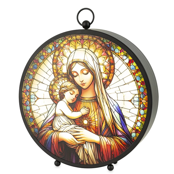 Witrażowy lampion LED z Maryją z Dzieciątkiem, w eleganckiej czarnej ramie z metalu i szkła. Emituje delikatne światło, które podkreśla religijny charakter dekoracji. Idealny na święta, do domu lub jako prezent.