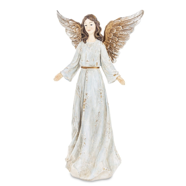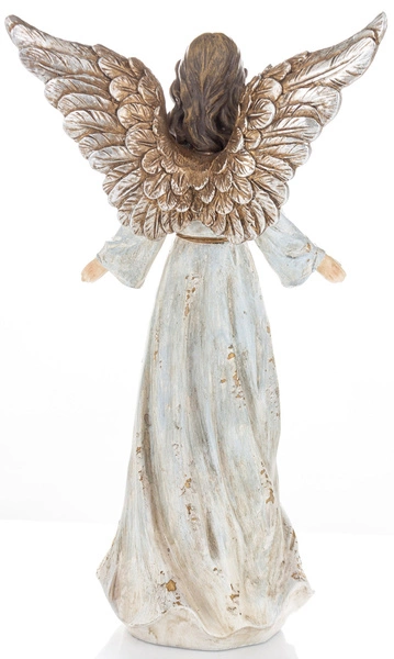 Dekoracyjna figurka anioła. Ubrana w białą, przecieraną sukienkę oraz miedzianymi skrzydłami. Stylowa i symboliczna ozdoba na święta lub do całorocznej dekoracji wnętrza. Doskonale prezentuje się na komodzie, parapecie lub półce.