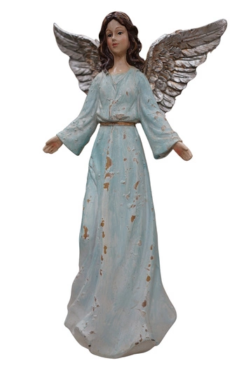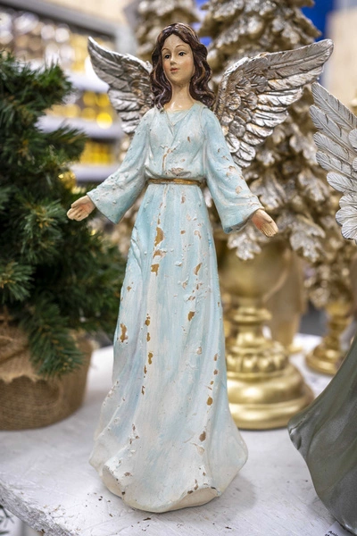 Anioł w miętowej sukni, pozłacane skrzydła 30 cm to subtelna ozdoba, która łączy świeżość mięty z ciepłym, złotym połyskiem. Delikatnie fakturowana sukienka pięknie współgra z eleganckimi skrzydłami, tworząc dekorację pełną spokoju i wdzięku. Ta figurka wprowadzi do salonu, sypialni czy holu przytulny nastrój, a w sezonie świątecznym podkreśli magię Bożego Narodzenia. Idealna jako dekoracja, dodatek do domu i nastrojowa ozdoba świąteczna.
