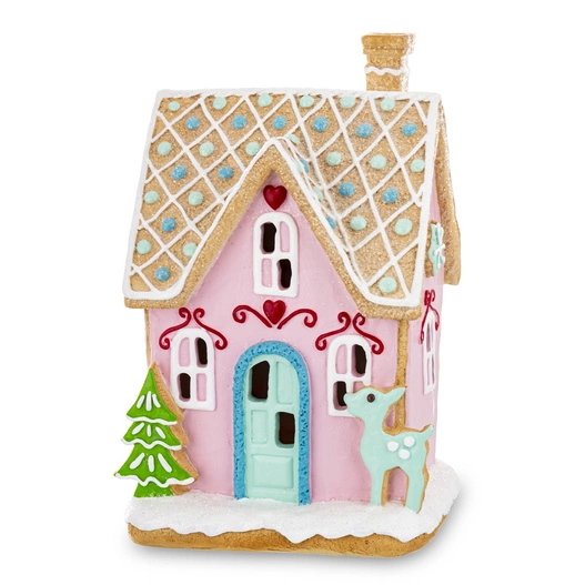 Dekoracyjny domek LED w pastelowym różu z niebieskimi drzwiami. Subtelne podświetlenie tworzy ciepły, bajkowy klimat - idealny do zimowych i świątecznych aranżacji. Stylowa ozdoba na parapet, komodę lub półkę. Zasilanie bateryjne (brak w zestawie).