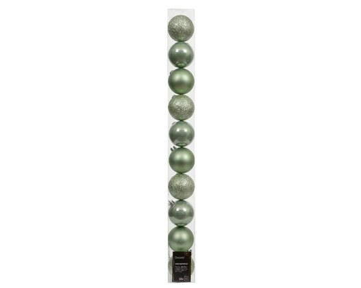 Zestaw 10 bombek choinkowych w odcieniu jasnej zieleni. Różnorodne wykończenia - mat, połysk i brokat - umożliwiają tworzenie efektownych dekoracji. Pakowane w estetyczną tubę. Idealne na choinkę, do stroików lub jako prezent.