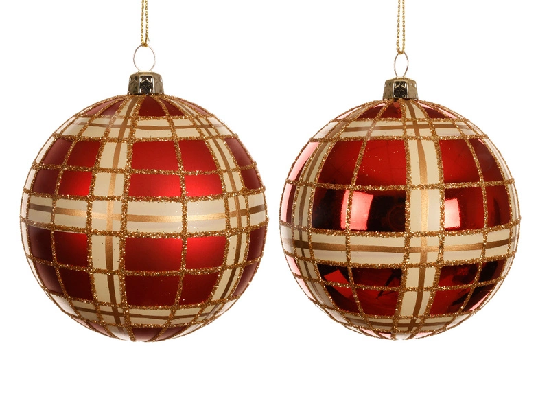 Bombka choinkowa o średnicy 8 cm w czerwono-kremowej kratce. Do wyboru wariant matowy lub z połyskiem. Wykonana z lekkiego tworzywa, idealna do klasycznych aranżacji świątecznych. Doskonale prezentuje się zarówno solo, jak i w zestawach kolorystycznych.