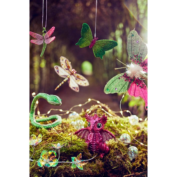 Bombka choinkowa w kształcie smoka, dostępna w kolorze różowym lub zielonym. Wysokość 10,5 cm. Nietypowa ozdoba dla fanów bajek, fantasy i oryginalnych dekoracji świątecznych. Starannie wykonana, idealna na prezent lub do wyjątkowej aranżacji.