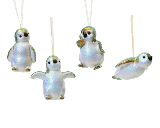 Zawieszka świąteczna w kształcie opalizującego pingwina w biało-zielonej kolorystyce. Wysokość 8,6 cm. Dostępna w 4 różnych wzorach – każda figurka ma unikalne dodatki i pozy. Lekka, wesoła i efektowna ozdoba do choinki, stroików lub świątecznych prezentów.