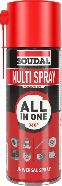 Preparat MULTI SPRAY Soudal doskonale sprawdza się przy odblokowywaniu zardzewiałych śrub i połączeń gwintowych, smarowaniu zawiasów, zamków, prowadnic, ochronie narzędzi, łańcuchów i mechanizmów przed wilgocią oraz poprawie kontaktów elektrycznych. Idealny do konserwacji urządzeń i elementów narażonych na działanie niekorzystnych warunków atmosferycznych.