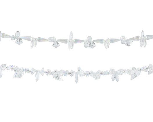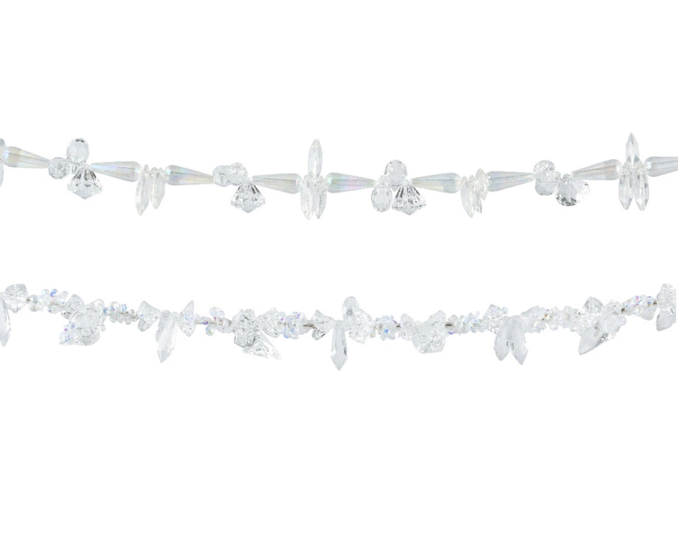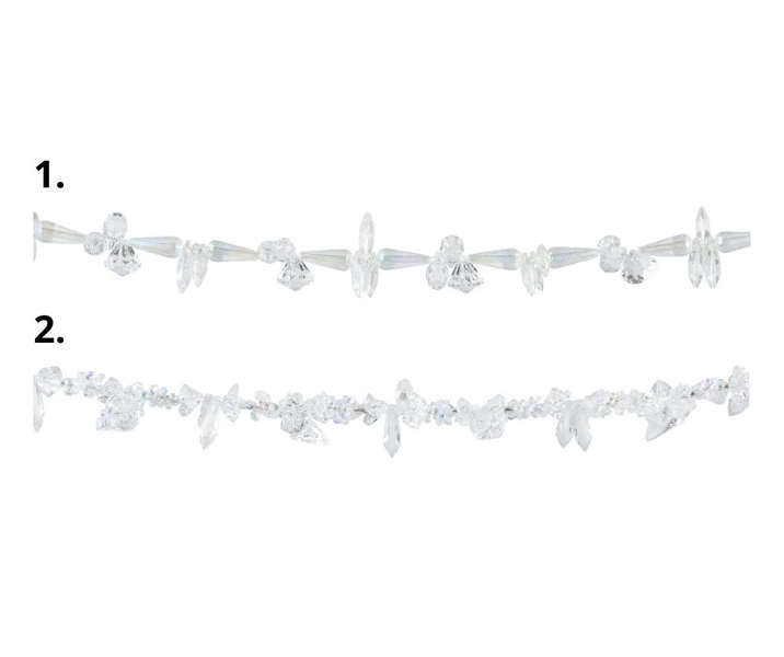 Transparentna girlanda z akrylowych kryształków o długości 150 cm. Doskonała jako ozdoba świąteczna, weselna lub do eleganckich aranżacji wnętrz. Dwa różne wzory do wyboru. Efektownie odbija światło, tworząc subtelny, dekoracyjny akcent.