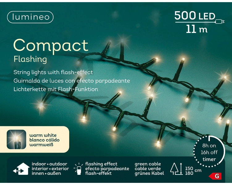 Lampki LED Compact z 500 diodami w odcieniu bardzo ciepłej bieli to idealne rozwiązanie na choinki o wysokości 1,5–1,8 m. Długość świecąca 11 m, zielony przewód oraz 8 funkcji świecenia z efektem flesza. Przeznaczone do użytku wewnętrznego i zewnętrznego – sprawdzą się zarówno w domu, jak i na balkonie czy w ogrodzie. Trwałe, energooszczędne i gotowe do użytku od razu po podłączeniu.