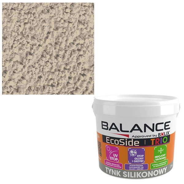Tynk silikonowy BALANCE EcoSide to masa dekoracyjna przeznaczona do wykańczania elewacji w systemach ociepleń ETICS na styropianie i wełnie mineralnej, a także do zastosowań wewnętrznych i na podłoża mineralne. Doskonała przyczepność, odporność na warunki atmosferyczne ✅