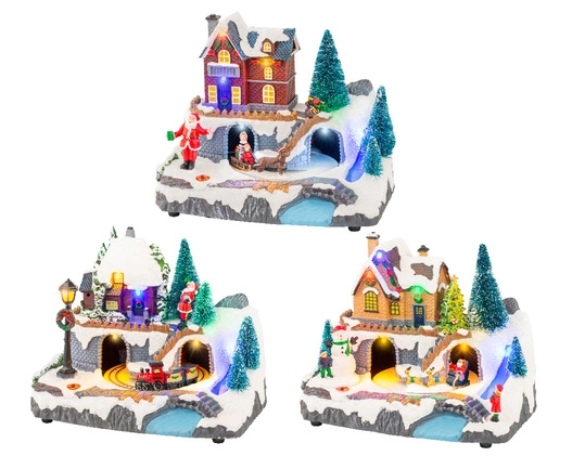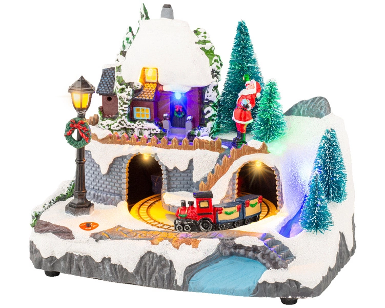 Niesamowicie urocza dekoracja bożonarodzeniowa. Jest to scenka, która przedstawia świąteczną wioskę. Wszystko wyposażone zostało w LED-owe oświetlenie, a także dźwięk świątecznej melodii. Ozdoba ta wprowadza do wnętrza ogrom uroku i roztacza piękno świąt po całym domu.