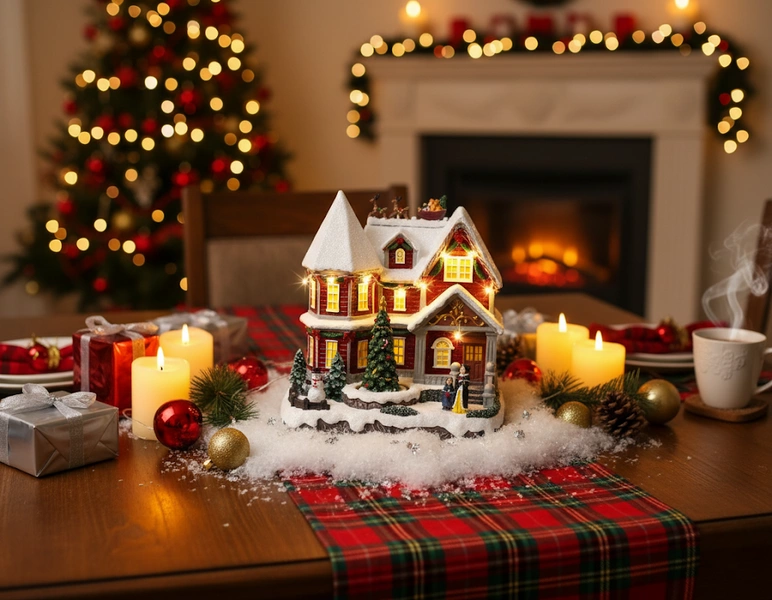 Dekoracyjny domek LED w kolorze bordowym z białym dachem. Przed domkiem obracająca się choinka. Wyjątkowy akcent świąteczny lub całoroczny do każdego wnętrza. Domek świeci ciepłym światłem LED i odtwarza melodię, wprowadzając magiczny klimat.