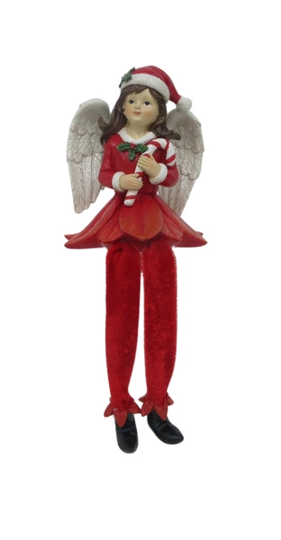 Świąteczny aniołek w czerwonym ubraniu, trzymający laskę cukrową, to urocza dekoracja. Posiada miękkie, zwisające nogi – idealny do posadzenia na kominku, półce czy parapecie. Wykonany z dbałością o detale, w klasycznej kolorystyce bożonarodzeniowej. Dodaje wnętrzu ciepła i radości. Idealny jako ozdoba świąteczna lub prezent. Świetnie komponuje się z innymi figurkami z tej serii.