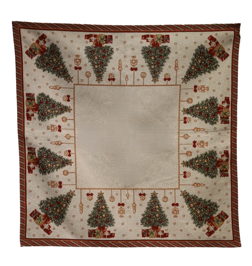 Świąteczny obrus 85x85 cm z motywem choinki oraz zwisających bombek to prawdziwa ozdoba każdego stołu. Jego kremowa tkanina, ozdobiona bordową obramówką, tworzy wyjątkowo przytulny klimat – zarówno w jadalni, jak i w salonie. Obrus zachwyca subtelnym połyskiem i eleganckim wzorem, który wprowadza do wnętrza radosny, świąteczny nastrój. To nie tylko praktyczny dodatek, ale również stylowa dekoracja, która podkreśli wyjątkowość wspólnych chwil przy stole.