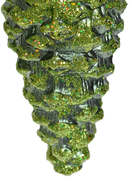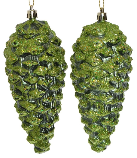 Komplet dwóch bombek w kształcie szyszek w klasycznym zielonym kolorze, każda o długości 17 cm. Wykonane z lekkiego, trwałego tworzywa, idealne do zawieszenia na choince lub wkomponowania w świąteczne stroiki i girlandy. Strukturalna powierzchnia imituje naturalną szyszkę, a oprószający je delikatnie brokat dodaje dekoracji elegancji i uroku. Świetne zarówno do wnętrz tradycyjnych, jak i nowoczesnych.