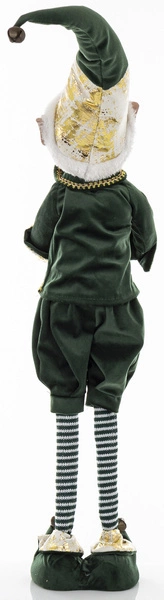 Stojący elf z miękkiego, zielonego aksamitu, trzymający świąteczne prezenty. Urocza dekoracja o wysokości 72 cm(zmniejszająca się do 50 cm), idealna do ustawienia przy choince, kominku lub w witrynie. Wprowadza magiczny, bajkowy klimat do każdego wnętrza.