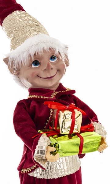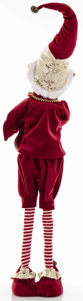 Stojący elf z miękkiego, czerwony aksamitu, trzymający świąteczne prezenty. Urocza dekoracja o wysokości 72 cm(zmniejszająca się do 50 cm), idealna do ustawienia przy choince, kominku lub w witrynie. Wprowadza magiczny, bajkowy klimat do każdego wnętrza.