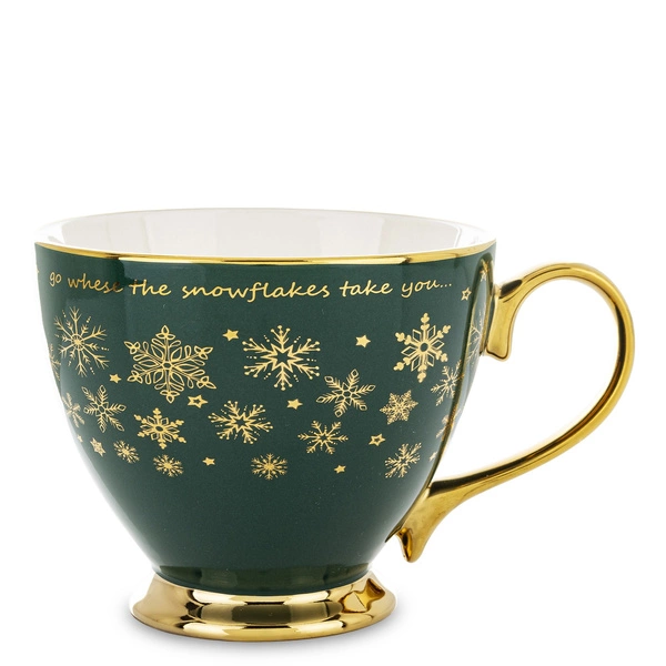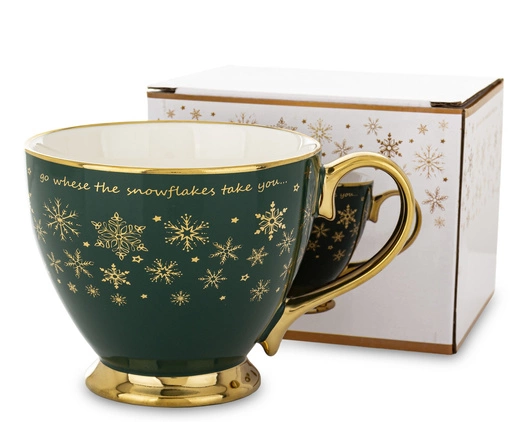 Filiżanka ceramiczna zielona 380ml złote gwiazdki, na stopce świetnie sprawdzi się podczas codziennych chwil z ulubioną kawą, herbatą lub gorącą czekoladą. Doskonała jako świąteczna ozdoba stołu, na rodzinne spotkania, eleganckie przyjęcia czy jako oryginalny prezent.
