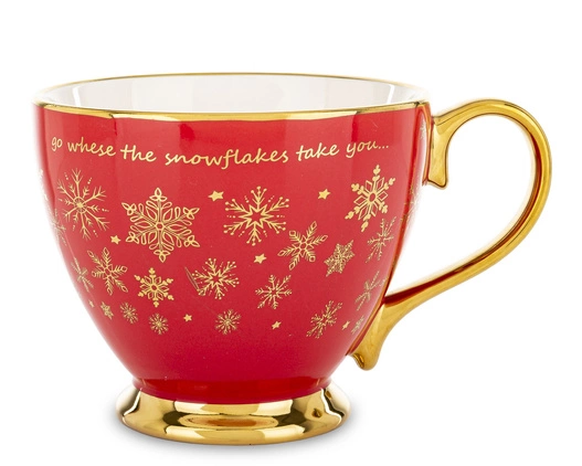 Filiżanka ceramiczna czerwona 380ml złote śnieżynki, na stopce doskonale sprawdzi się do serwowania kawy, herbaty i gorącej czekolady podczas świątecznych spotkań, rodzinnych uroczystości i codziennych chwil relaksu. Stanowi także stylową ozdobę stołu oraz efektowny element prezentowy.