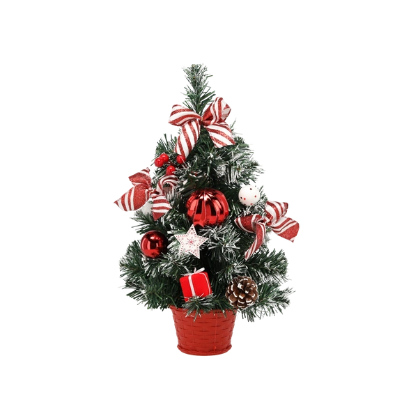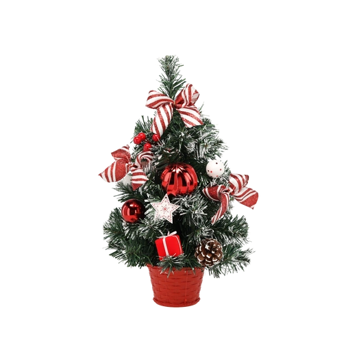 Sztuczna mała choinka, która wnosi do wnętrza wspaniały klimat świąt Bożego Narodzenia. Umieszczona została w czerwonej plastikowej doniczce. Utrzymana w biało-czerwonej kolorystyce.