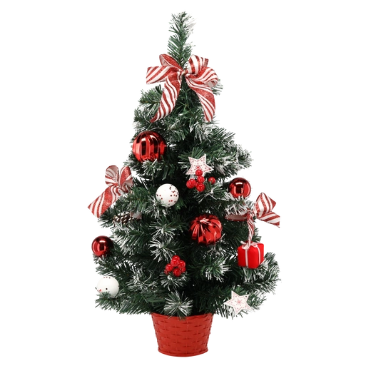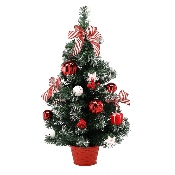Sztuczna mała choinka, która wnosi do wnętrza wspaniały klimat świąt Bożego Narodzenia. Umieszczona została w czerwonej plastikowej doniczce. Utrzymana w biało-czerwonej kolorystyce.