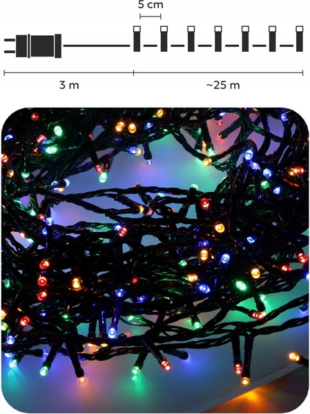 Oświetlenie świąteczne do stosowania wewnątrz i na zewnątrz, składające się z 500 ledowych lampek umieszczonych na czarnym przewodzie. Lampki świecą wielokolorowym światłem. Stanowią bardzo atrakcyjną dekorację, która nada magii w czasie świąt Bożego Narodzenia.