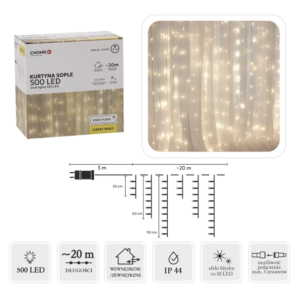Kurtyna świetlna z efektem sopli o długości 20 metrów + 3 metry kabla zasilającego. Wyposażona w 500 diod LED emitujących ciepłe białe światło z efektem flash. Przeznaczona do użytku zewnętrznego i wewnętrznego – idealna do dekoracji balkonów, dachów, elewacji, okien czy wnętrz. Tworzy efekt migoczących sopli lodu, wprowadzając magiczną, świąteczną atmosferę. Zasilanie sieciowe, odporność na warunki atmosferyczne.