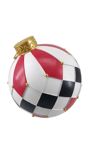 Dekoracyjna bombka MAXI w świątecznych kolorach: czerwieni, bieli i czerni. Wykonana z trwałego poliresingu, ma imponującą średnicę 35 cm i doskonale sprawdzi się jako centralny element dekoracji w domu, witrynie sklepowej, hotelowym lobby czy podczas eventów. Efektowna i solidna - przyciąga wzrok i podkreśla świąteczny charakter wnętrza. Idealna do aranżacji pod choinką lub jako samodzielna ozdoba w stylu glamour.