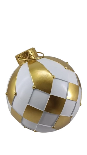 Imponująca bombka w klasycznych, świątecznych kolorach bieli i złota, o średnicy 35 cm. Efektowna dekoracja, która przyciąga wzrok i tworzy wyjątkowy, bożonarodzeniowy klimat. Można ją ustawić przy drzwiach wejściowych do domu (pod zadaszeniem) lub pod choinką.