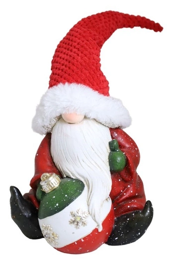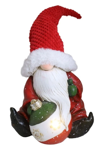 Świąteczna figurka siedzącego Mikołaja z dużą bombką w biało-czerwono-zielonych barwach. Oświetlenie LED nadaje dekoracji przytulnego blasku, idealnego do stworzenia magicznej atmosfery. Figurka świetnie prezentuje się na komodzie czy pod choinką. Klasyczna kolorystyka i staranne detale czynią tę ozdobę doskonałym wyborem do wnętrz domowych i komercyjnych.