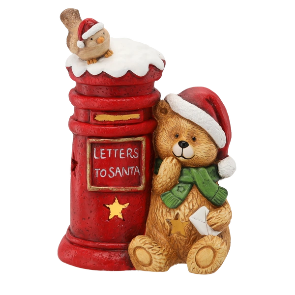 Figurka Miś ceramiczny LED brąz siedzący przy czerwonej skrzynce na listy 27x32,5cm