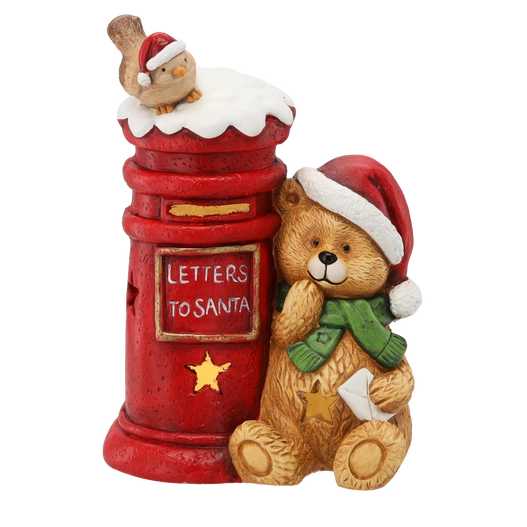 Uroczy ceramiczny miś w brązowym kolorze, siedzący obok czerwonej skrzynki na listy do Świętego Mikołaja, to niezwykle klimatyczna dekoracja świąteczna. Subtelne podświetlenie LED rozświetla całość ciepłym blaskiem, wprowadzając magiczny nastrój do wnętrza. Starannie wykonany z dbałością o detale, idealnie sprawdzi się jako dekoracja na kominku, w oknie lub dziecięcym pokoju. Miś symbolizuje dziecięcą radość i oczekiwanie na święta, dlatego doskonale wpisuje się w rodzinne, zimowe aranżacje. Świetny również jako prezent, który zachwyci nie tylko najmłodszych.