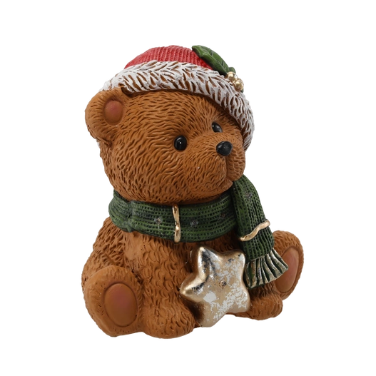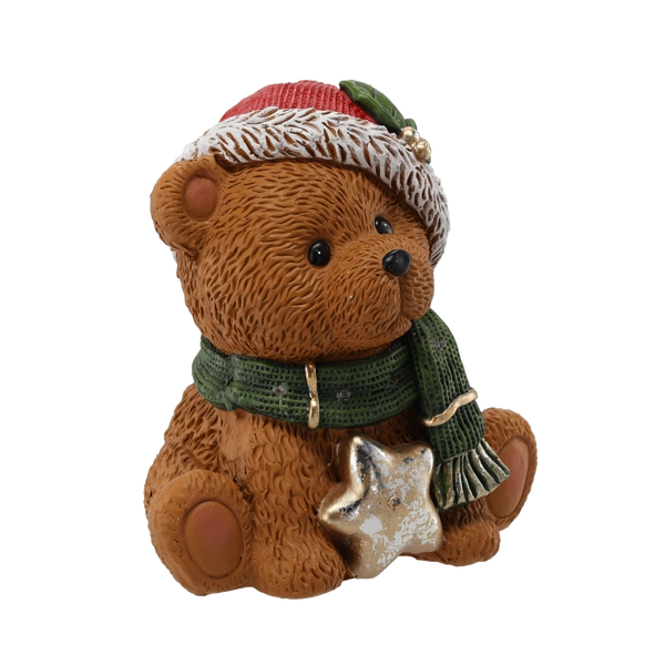 Uroczy ceramiczny miś w brązowym kolorze, ubrany w zielony szalik i trzymający złotą gwiazdkę, to idealna dekoracja świąteczna. Delikatne światło LED dodaje mu ciepłego blasku, tworząc przytulną atmosferę w każdym wnętrzu. Miś symbolizuje radość, ciepło i dziecięcą magię świąt, dlatego doskonale sprawdzi się zarówno w salonie, jak i pokoju dziecięcym. Wykonany z wysokiej jakości ceramiki i starannie wykończony, będzie wyjątkową ozdobą świąteczną przez wiele sezonów. Idealny również na prezent - zachwyca urokiem i świątecznym klimatem.