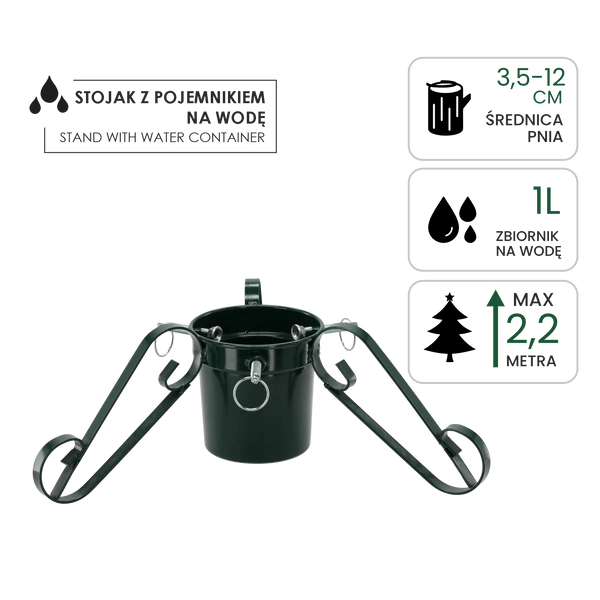 - Stojak do choinki metal 3 ramienny max 2,2m zielony z pojemnikiem na wodę1l średnica pnia 3,5-12cm