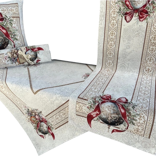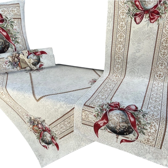 Świąteczny bieżnik z motywem bombki z czerwoną kokardą. Idealny do udekorowania stołu w jadalni, salonie czy kuchni. Sprawdzi się zarówno na co dzień w okresie zimowym, jak i podczas uroczystych spotkań przy wigilijnym stole. Starannie wykończony, łatwy do utrzymania w czystości i idealny do aranżacji z innymi dodatkami świątecznymi.