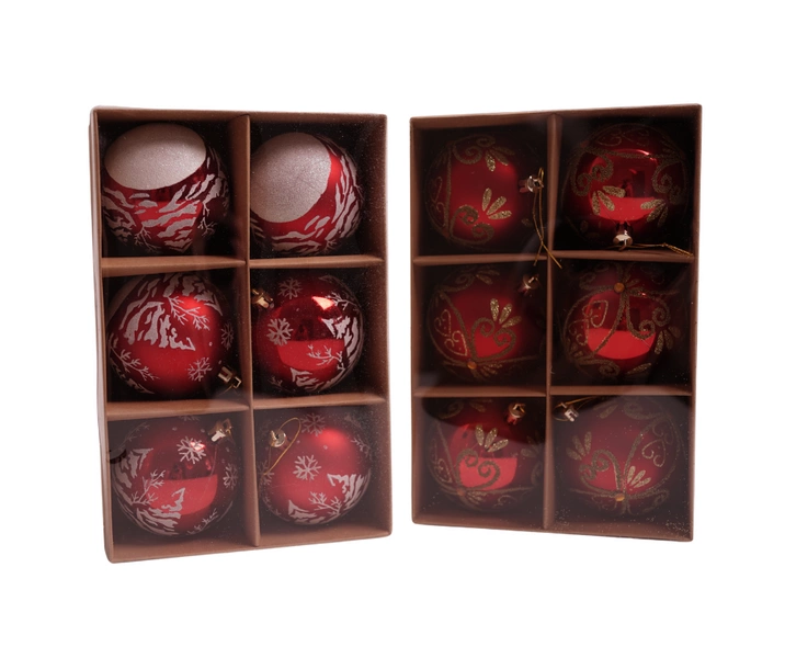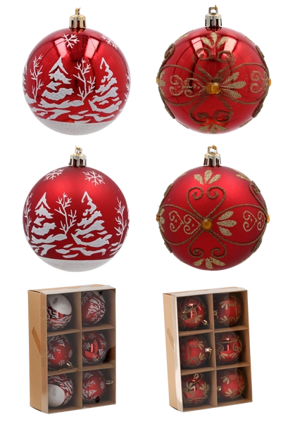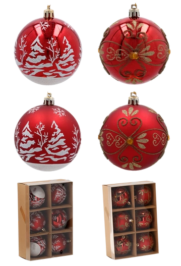 - Bombki czerwone białe choinki/złote wzory 6 sztuk 8cm