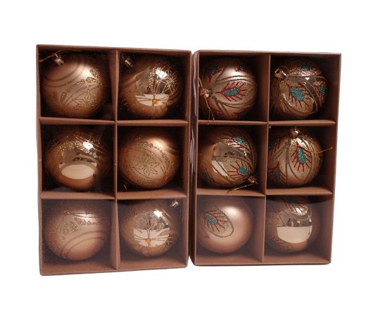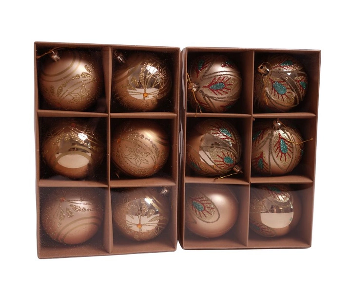 Zestaw 6 bombek choinkowych w złotej kolorystyce w 2 wariantach do wyboru: ze złotym wzorem lub pawim okiem. Stanowią atrakcyjną formę dekoracji bożonarodzeniowego drzewka, podkreślającą klimat i nastrój świąt.