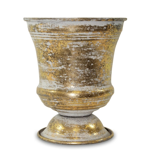 Kielich metalowy na nóżce w odcieniu złotej patyny to stylowa dekoracja, która od razu przyciąga wzrok. Delikatnie połyskująca powierzchnia tworzy wrażenie szlachetnego, lekko postarzanego metalu, dzięki czemu kielich pięknie wpisuje się zarówno w klasyczne, jak i nowoczesne wnętrza.