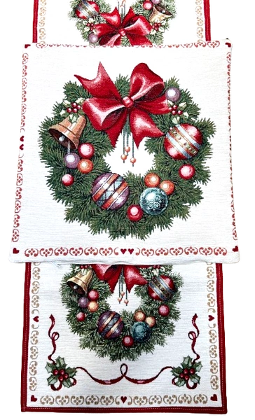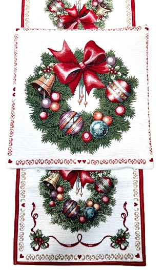 Świąteczny bieżnik z motywem wieńca, bombek i czerwonej kokardy. Idealny do udekorowania stołu w jadalni, salonie czy kuchni. Sprawdzi się zarówno na co dzień w okresie zimowym, jak i podczas uroczystych spotkań przy wigilijnym stole. Starannie wykończony, łatwy do utrzymania w czystości i idealny do aranżacji z innymi dodatkami świątecznymi.