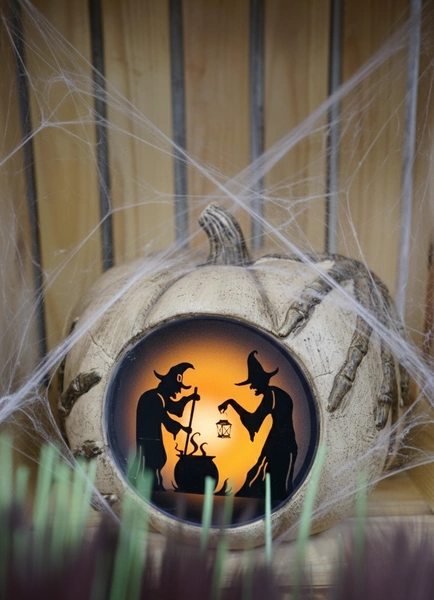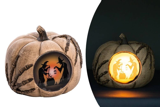 Dekoracyjna dynia z motywem wiedźm, wykonana z ceramiki i podświetlana światłem LED. Dzięki subtelnemu podświetleniu tworzy wyjątkowy, nastrojowy klimat - idealna na Halloween i jesienne aranżacje wnętrz. Sprawdzi się jako ozdoba na komodzie czy parapecie, a także jako element dekoracji imprezy halloweenowej.